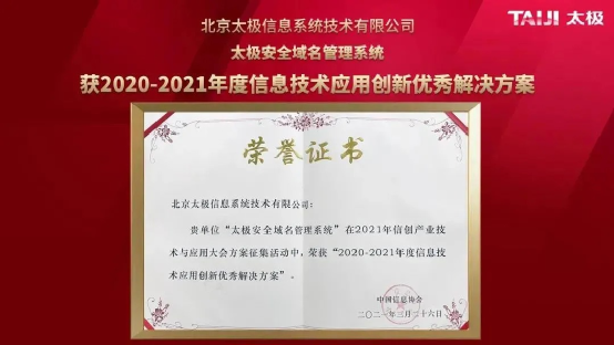 “太極安全域名管理系統(tǒng)”曾榮獲2020—2021年度信息技術(shù)應(yīng)用創(chuàng)新優(yōu)秀解決方案