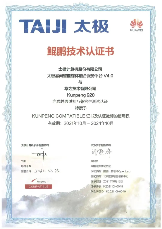 “太極智能媒體融合服務(wù)解決方案”已與華為鯤鵬完成兼容性互認(rèn)證